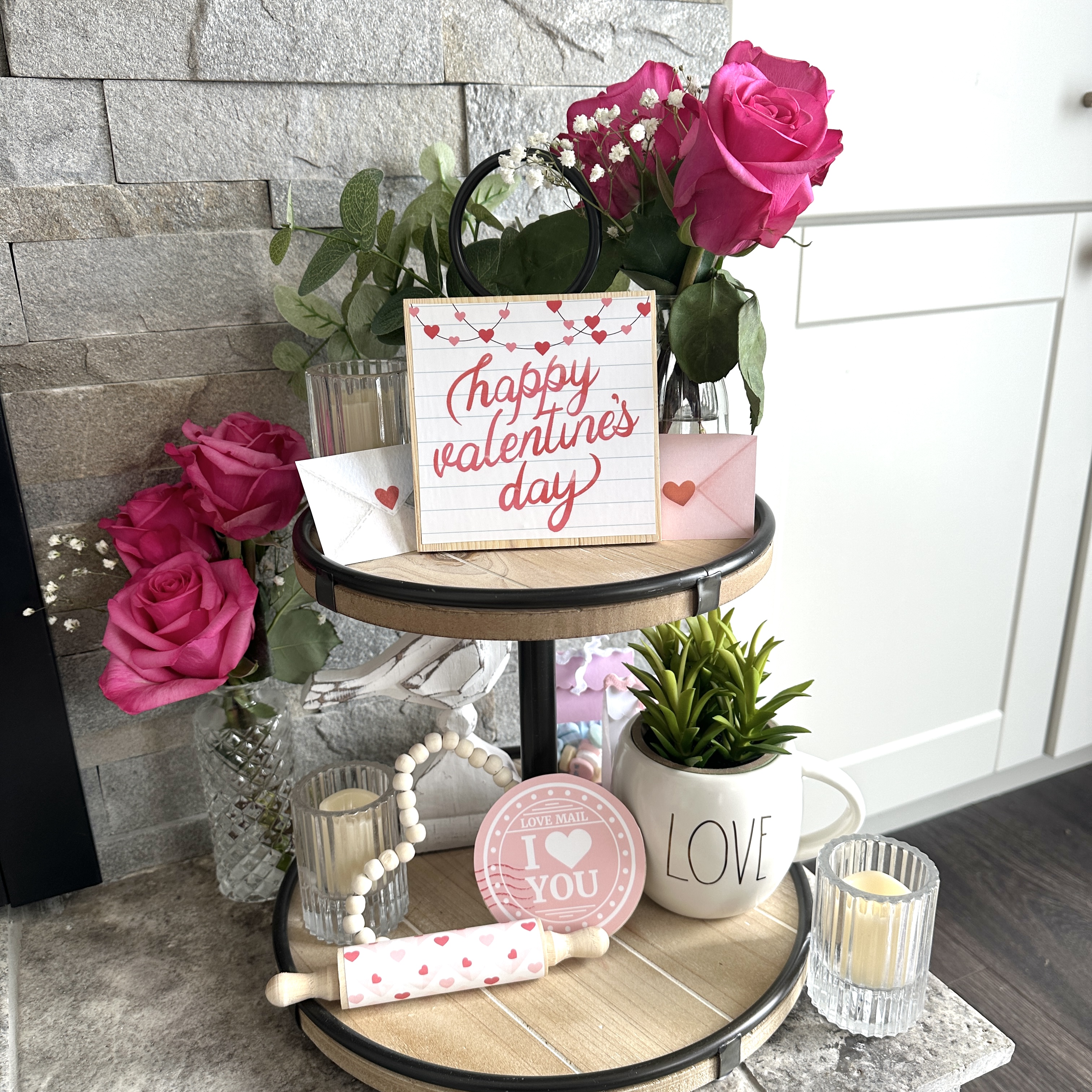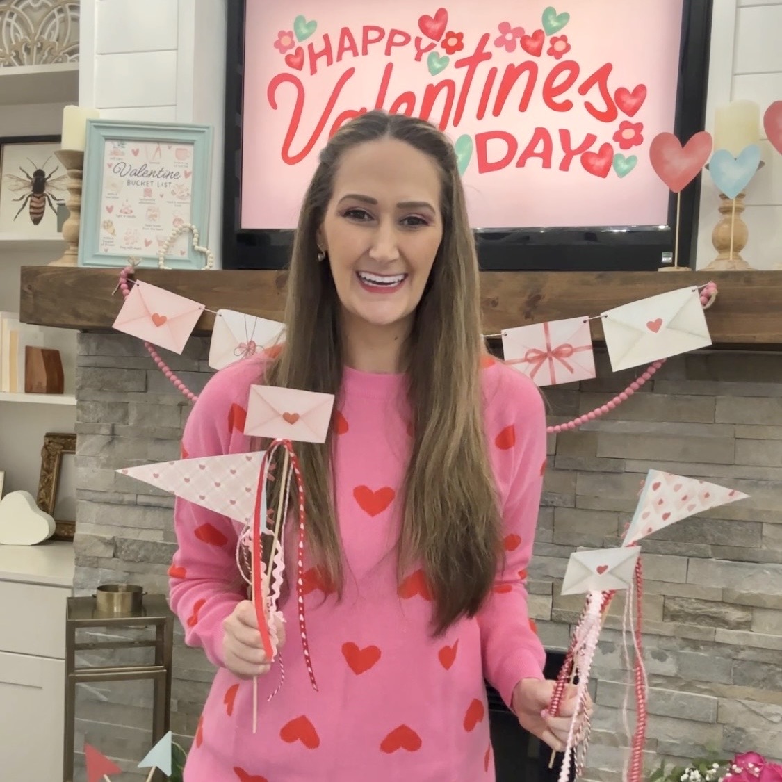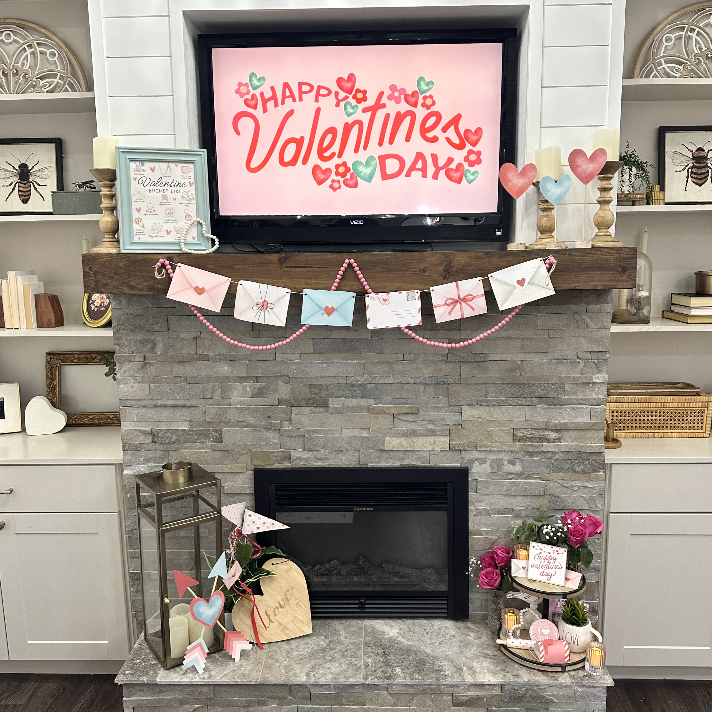 I also want to highlight the adorable love letter banner on the fireplace. There are 3 printable files to give you 6 unique love letter envelopes. Print, punch holes in the corners, add to a string and hang!
