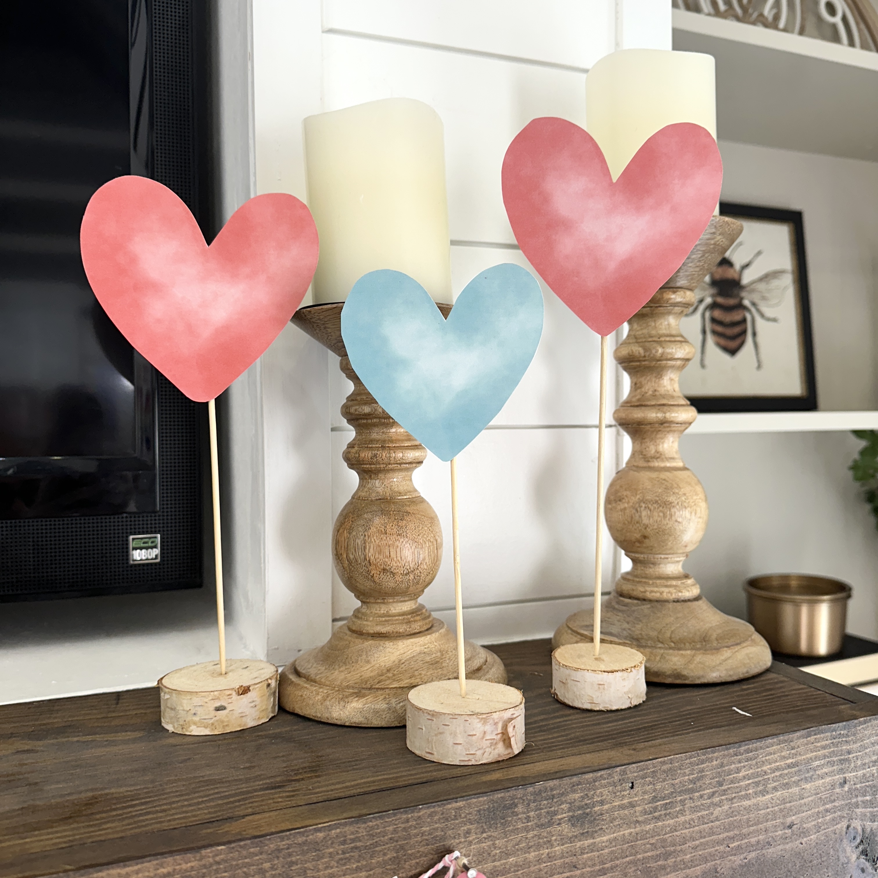 The hearts look familiar, don't they? These hearts are attached to BBQ skewers (you get 100 of these for $1.25 at Dollar Tree!) and then inserted into mini wood slices. You could also insert them into a flower arrangement, styrofoam, and more!