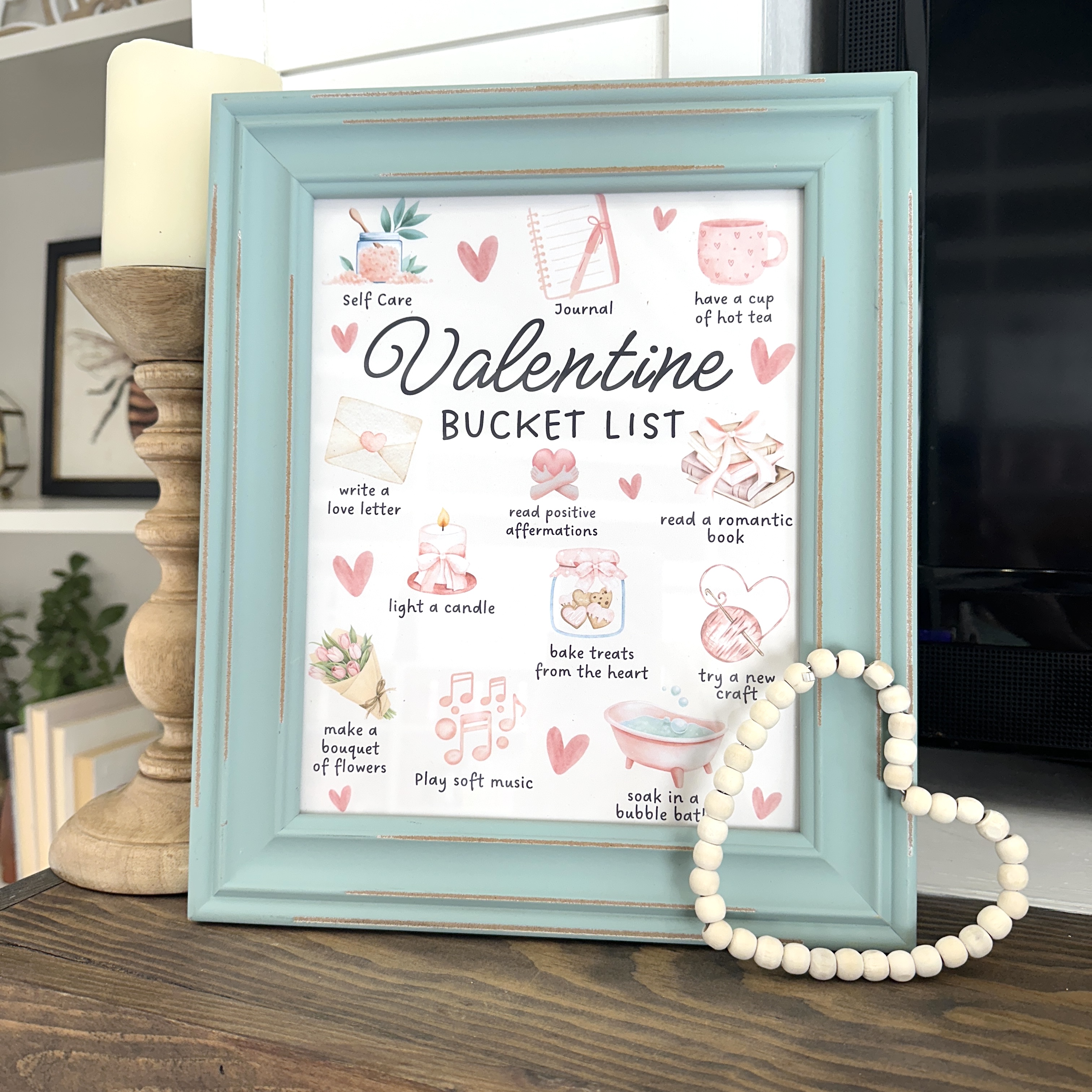 I love a good bucket list. Especially this kind that includes "self care" as one of the activities listed. It also makes for quick and easy decorative art. Simple print, frame (8x10 size), and display!