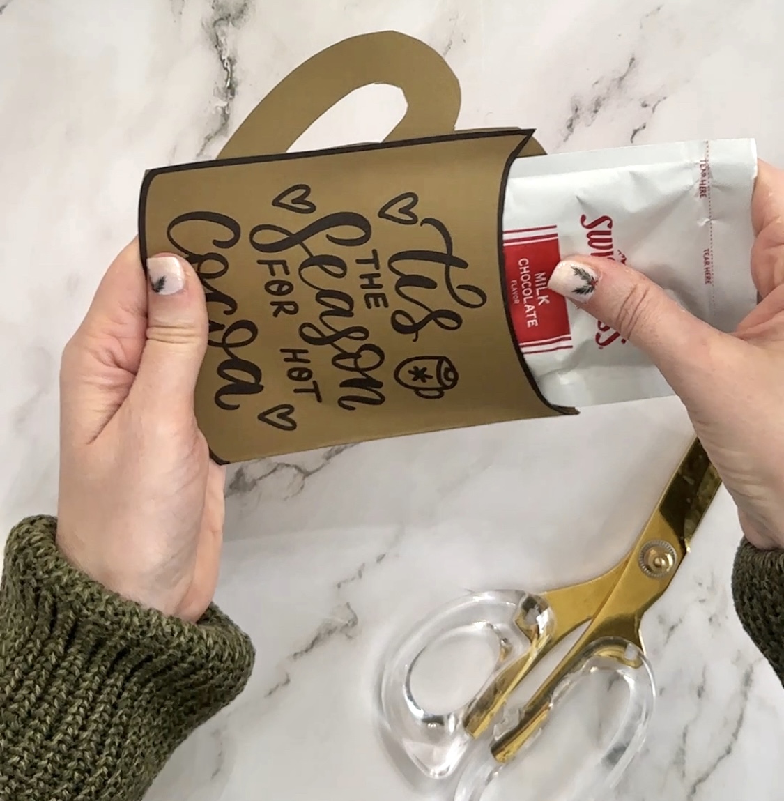If this catches you before Christmas, there are a few printables that might help with the last minute gift idea rush. These cocoa pockets are super quick to print, cut, glue together and fill with holiday or winter treats!