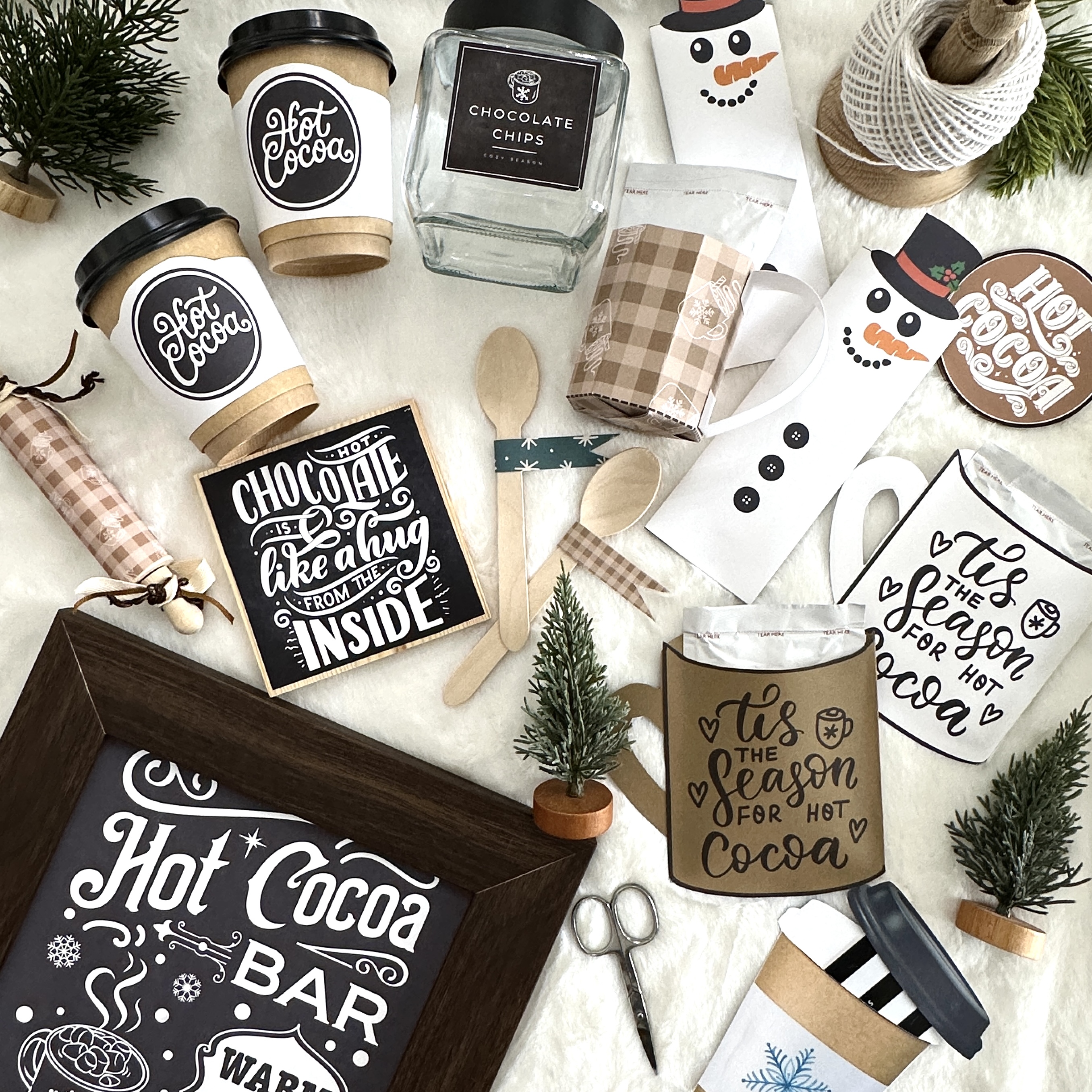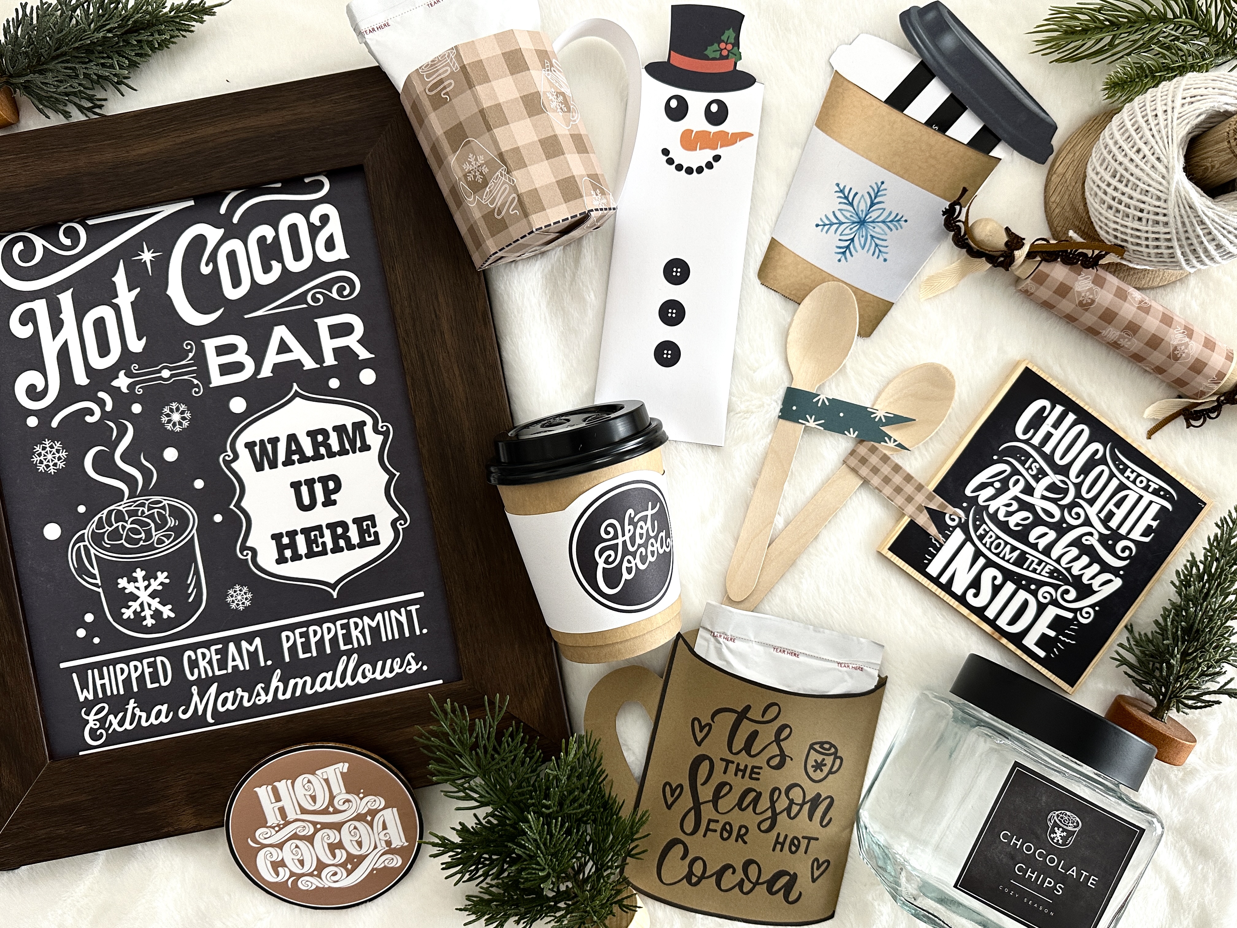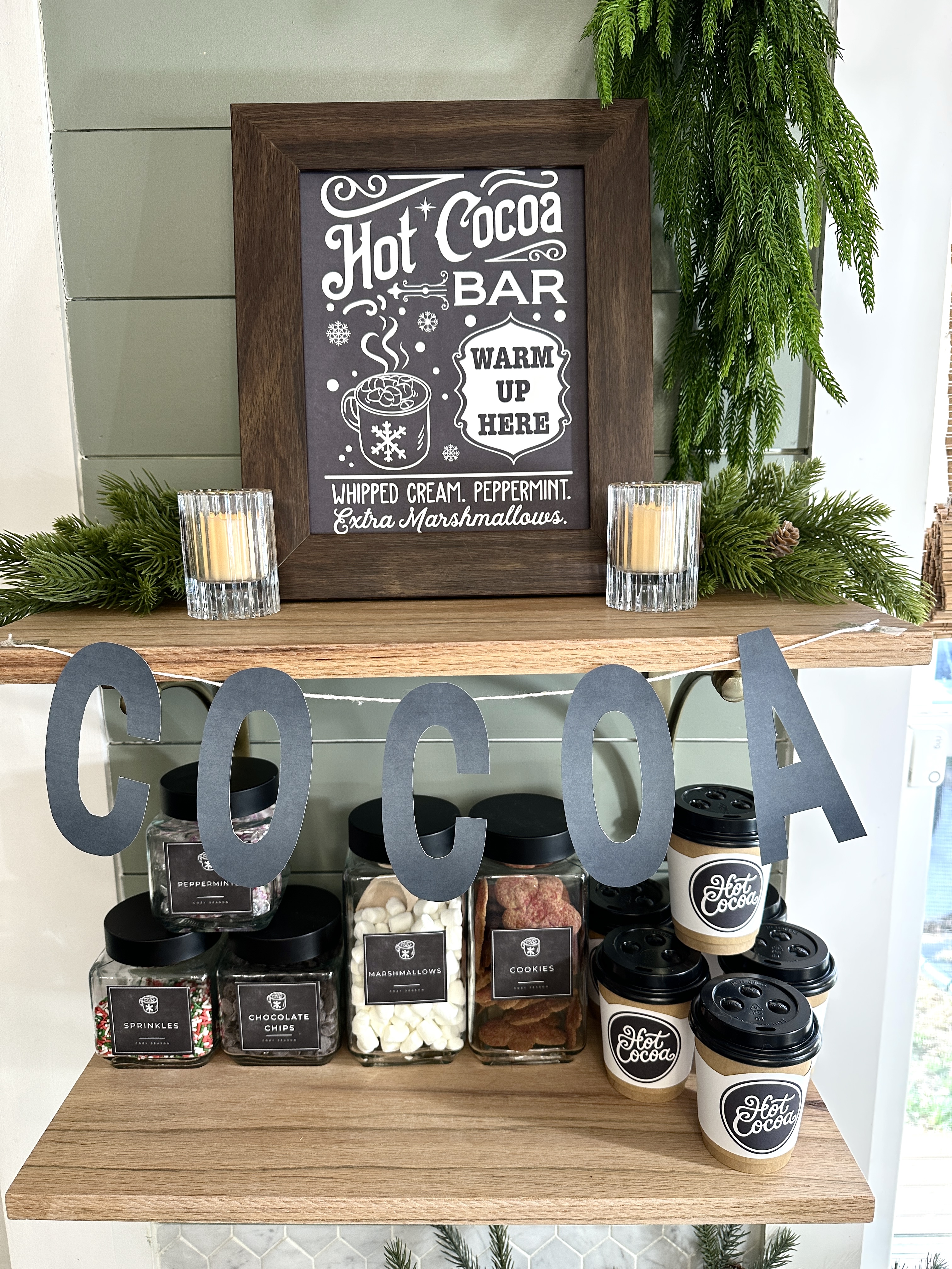 Make your own adorable hot cocoa bar! Included in this set to make things streamline are an 8x10 chalkboard sign you can frame, a "cocoa" banner that's easy to cut out and string, labels for your canisters (hint: print on printable vinyl for easy application!) and paper coffee cup wraps you can print, cut out, and taps onto paper cups. LOVE this cozy look!