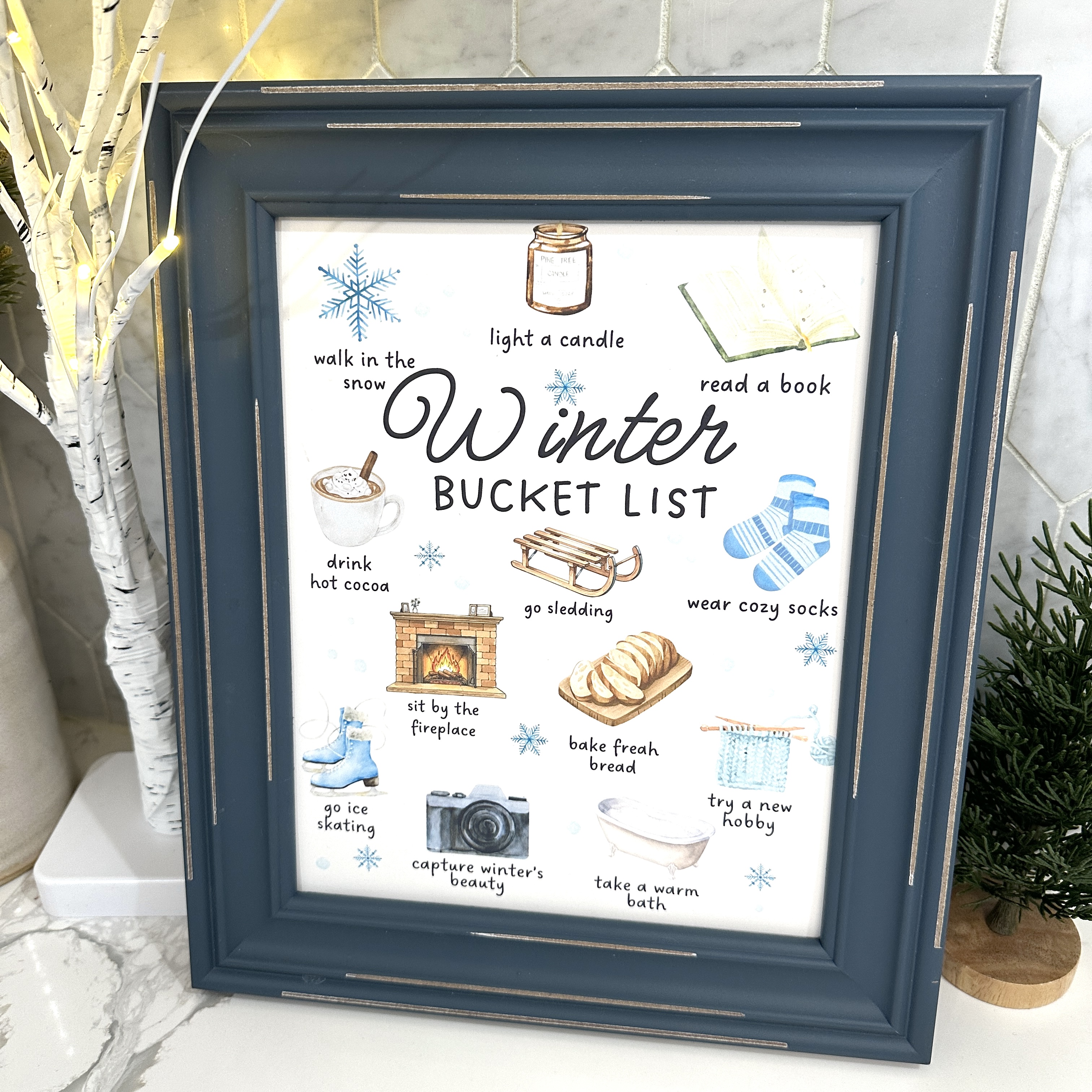 I LOVE BUCKET LISTS! Especially during the winter months when I feel like I'm stuck inside so much with nothing to do. This gets us out and moving and trying new things! You can frame this as decoration or if you frame this with a glass front, you can use a dry erase marker and cross off the bucket list items as you go. Then erase and save for next year's fun too!