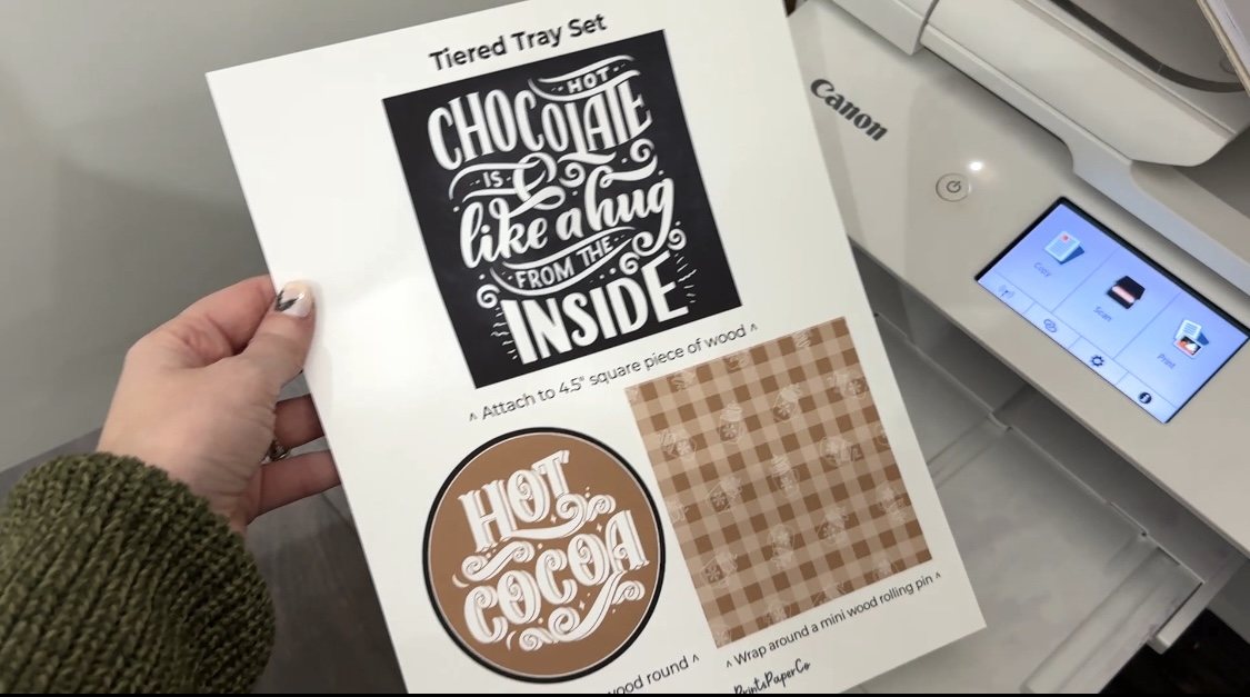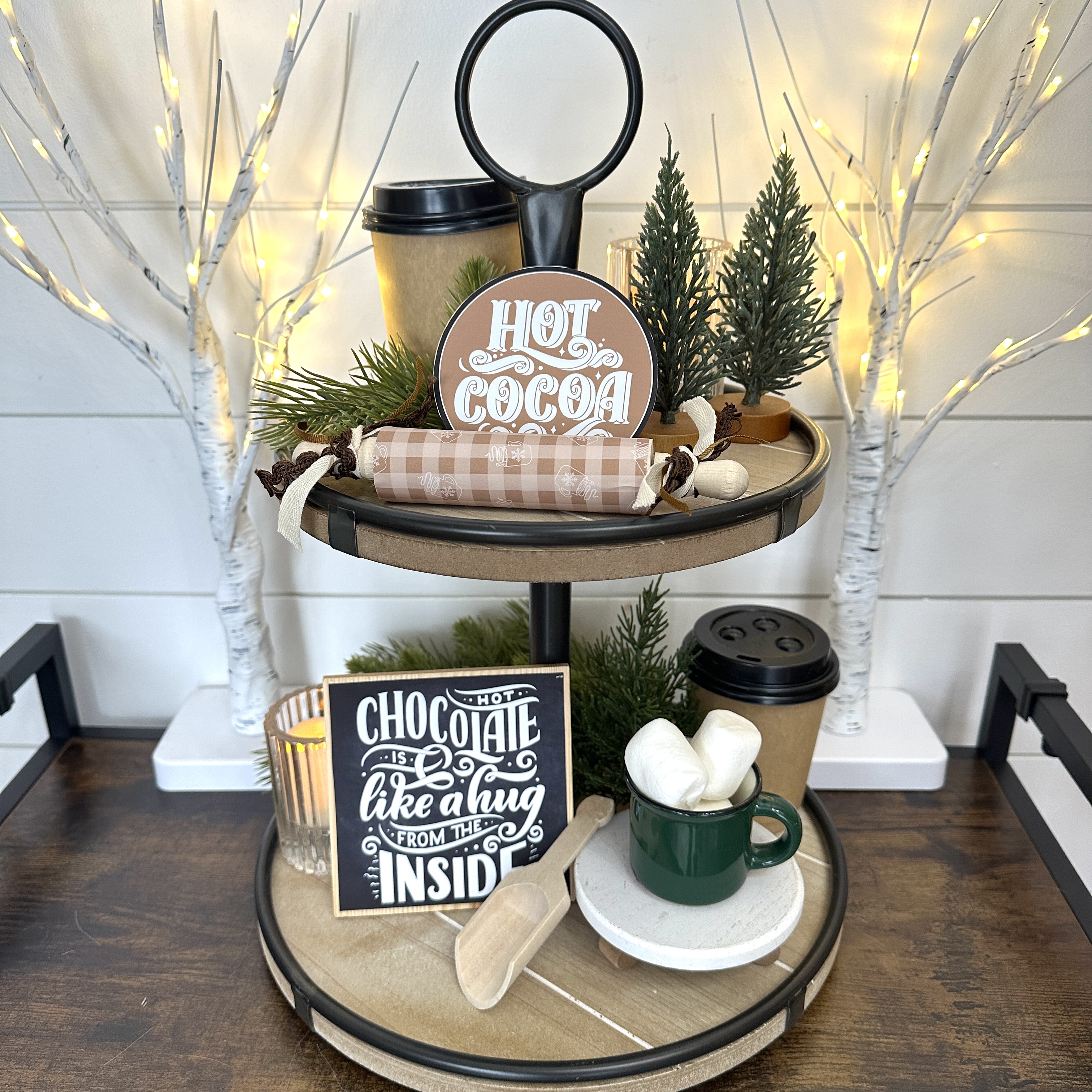 I'm a sucker for a tiered tray. They are a lot of fun to decorate. And I've given you an easy 3 piece set here for a winter cocoa themed tiered tray! Hint: print on printable sticker paper so you can easily apply to your wood square, wood round, and rolling pin.